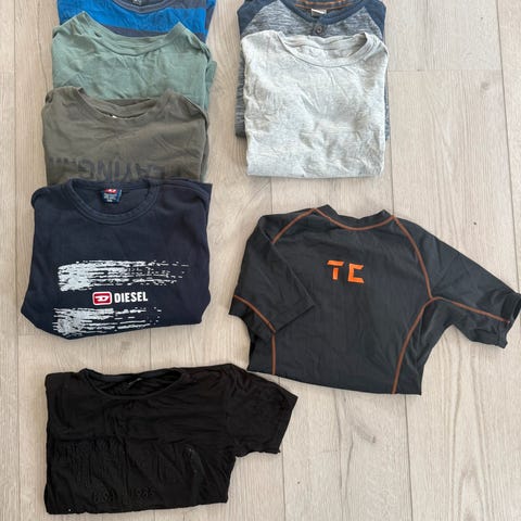 Helt og pent, blanding av ubrukt og brukt. Gamekontroll T-skjorte har lappen på. Boblevesten, blå shorts, en av skjortene er helt nye og aldri brukt. Litt misfarge på hvit tskjorte og grønn bukse (bilde). Størrelsen går fra 146-164, men alt ble brukt samme år.