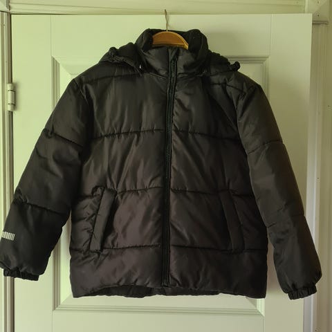 Lindex vinterjakke for barn i størrelse 140, grønn farge, unisex modell. Jakken har hette. Vannavisende og egnet for kaldt vær.