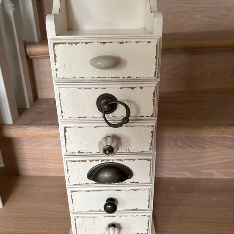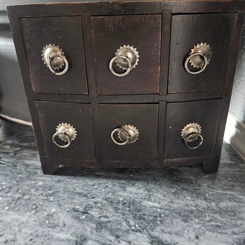 Trekommode med seks skuffer i naturfarget tre. Kommoden har en enkel design med runde knotter på hver skuffe. Passer til lagring av små gjenstander og kan plasseres på bord eller benk.