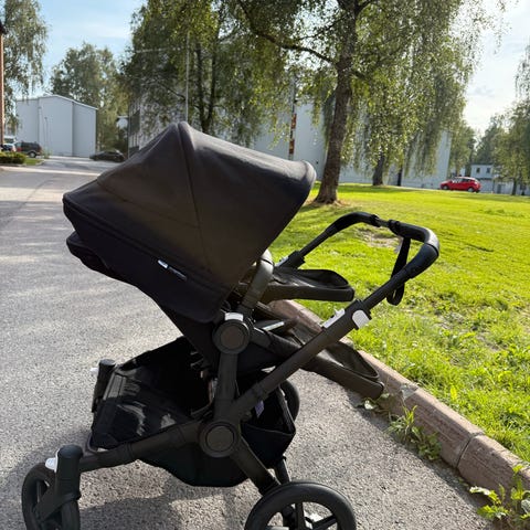 Bugaboo Donkey dobbelt barnevogn med grå tekstil. Passer for to barn samtidig, med justerbare seter og solskjermer. Utstyrt med oppbevaringskurv under og ekstra tilbehør inkludert. Ramme i aluminium og stoffmateriale i slitesterk kvalitet. Kjøpt ny i 2021, lite brukt. Liten merknad på regntrekk, se bilde. Det kommer også med en stativ til bilstol
