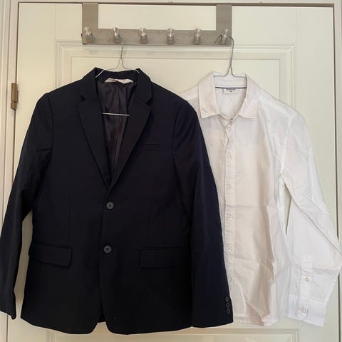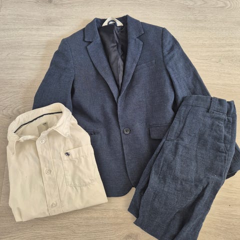 Selger pent brukt H&M dressjakke med bukse begge i str 146. Dressen er hel og pen i grått tweedaktig stoff. Hvit Skjorte i str 146-152 fra name it følger med