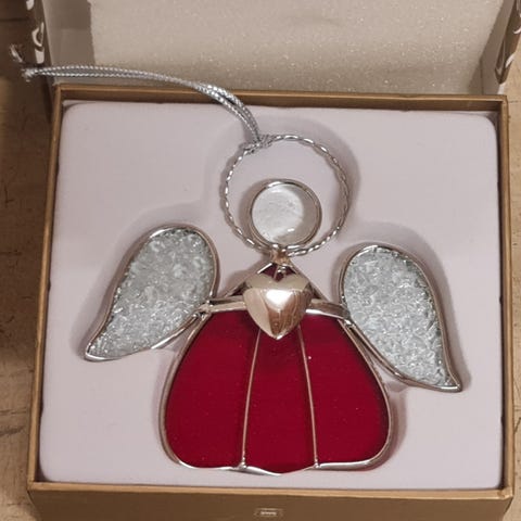 Glassengel julepynt i rød og klart teksturert glass med metallramme.