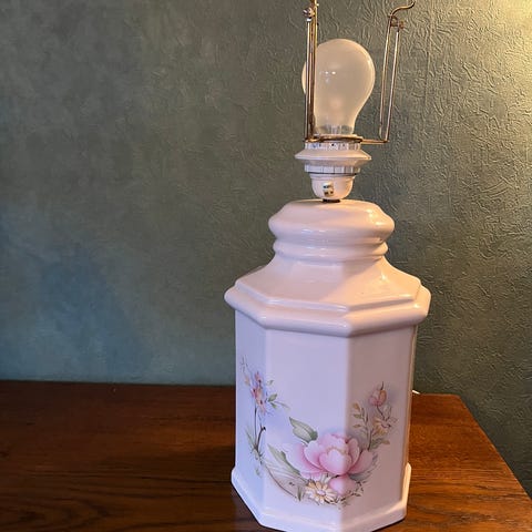 Høyde på porselenfoten er 13 cm og til toppen av lampeholderen er det 23 cm