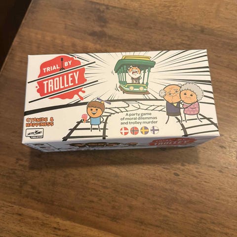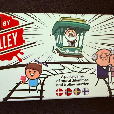 Trolley Brettspill med humoristisk tema. Spillet inkluderer kort og brikker som illustrerer ulike scenarier innen etiske dilemmaer. Passer for flere spillere og kan brukes til underholdning og diskusjon.
