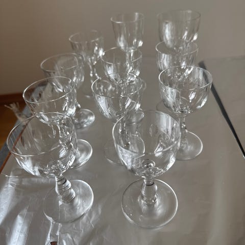 Selger et sett nydelige små glass på stett – perfekte til likør eller som de lekreste små «stemningsglass» på et vakkert dekket bord. Alle har sin egen sjarm – forskjellig størrelse og fasong som skaper personlighet på bordet.
