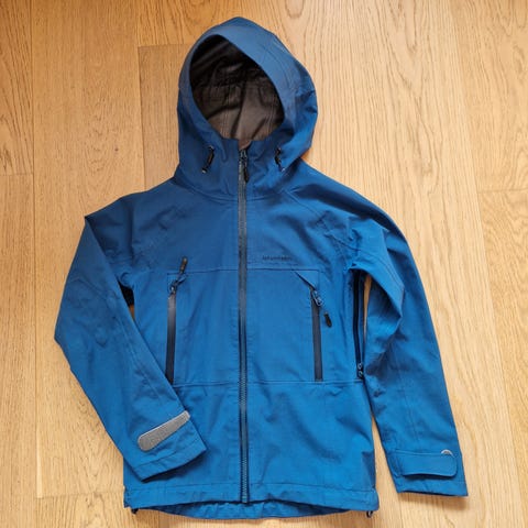 Jotunheim regnjakke med tapede sømmer som gjør jakka vanntett. str128. Fin jakke med stramming i hetta og i livet. To lommer med glidelås.