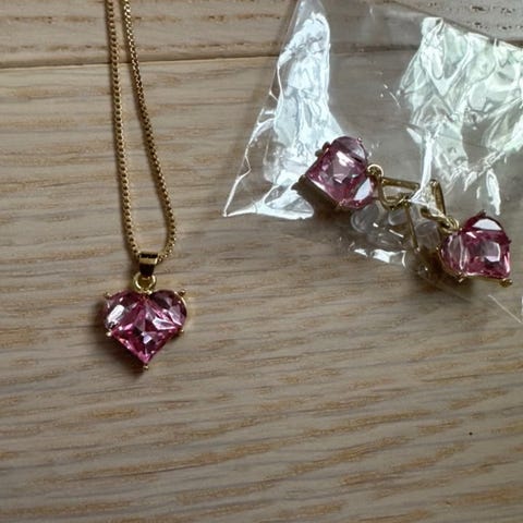 Halskjede med hjerte anheng med rosa og hvite krystaller, justerbar ring og øredobber.
