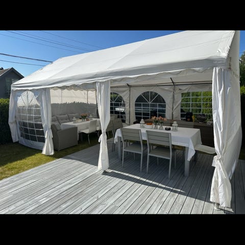 Obs Bygg Hagepaviljong med mål 3 meter x 6 meter, laget av hvit PVC-materiale. Produktet er designet for utendørs bruk og har store vinduer med buede rammer for naturlig lysinnslipp. Paviljongen er egnet for hagearrangementer og beskyttelse mot værforhold.