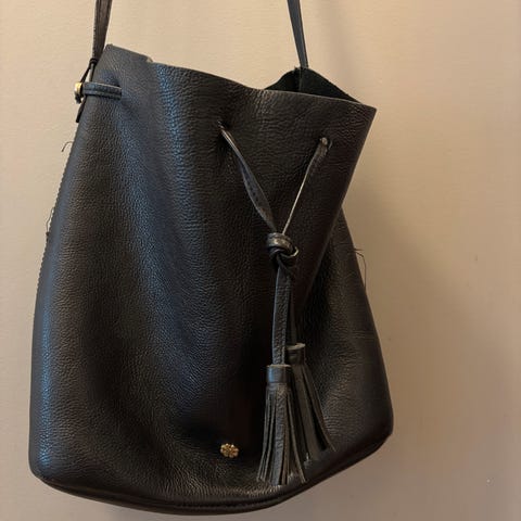 Selger en pent brukt Zara skulderveske i klassisk bøttefasong. Modellen stammer trolig fra perioden 2016–2018 og er ikke lenger i produksjon. Vesken er laget i kraftig, strukturert svart skinnimitasjon og har solid snørelukking med metallbeslag i gull. Festene på sidene er utført med karakteristiske knutedetaljer som gir et tydelig og stilrent uttrykk.