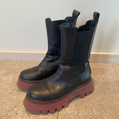 Stockholm Design Group Støvler i størrelse 37. Støvlene er laget av brunt skinn og har elastiske innsatser på sidene for enkel på- og avtaking. Designet for damebruk med en lav hæl og rund tåform.