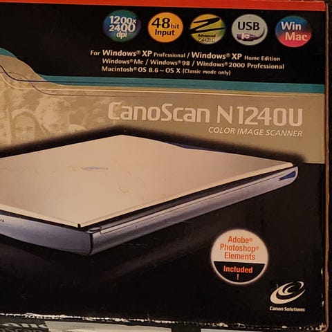 Canon CanoScan N650U Skanner med USB-tilkobling. Skanneren har en flatbed-design og er hvit i fargen. Egnet for digitalisering av dokumenter og bilder.