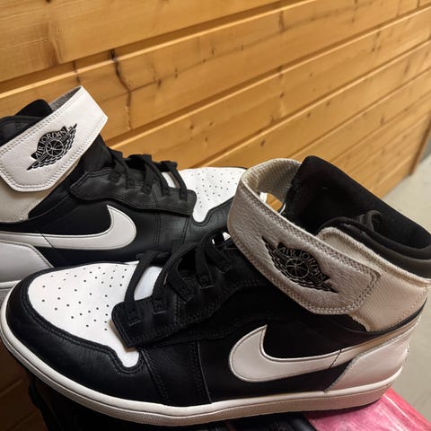Air Jordan Sneakers joggesko i størrelse 46. Fargekombinasjon i svart og rød. Skoene har høy ankelstøtte og klassisk design med hvit såle. Materialet er syntetisk skinn og tekstil, egnet for daglig bruk og sport.