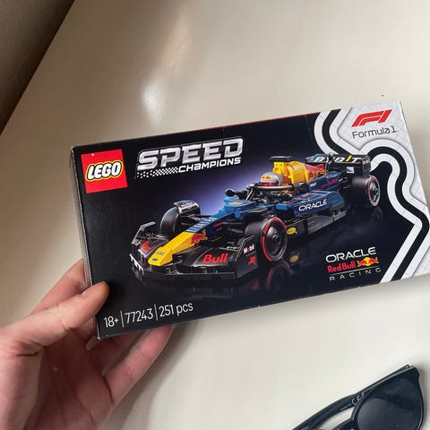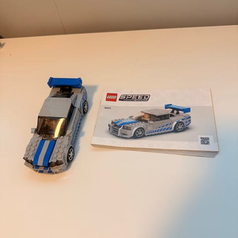 LEGO Speed Champions byggesett med ulike deler i flere farger, inkludert blå, grå og hvit. Settet inneholder små byggeklosser og deler som kan brukes til å bygge biler eller andre modeller innen Speed Champions-serien.