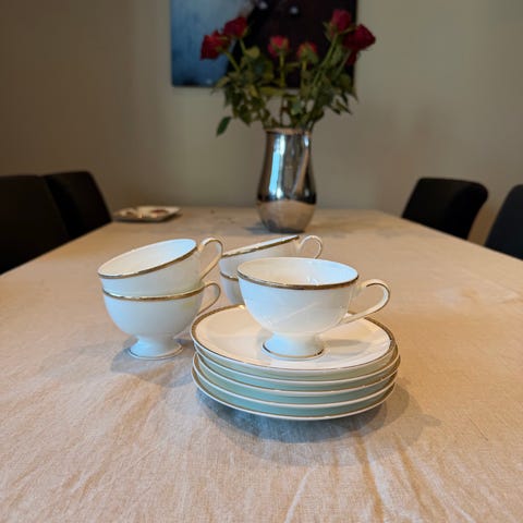 Selger 8 kopper + skåler fra Porsgrunds Porselænsfabrik, serien Nathalie Platinum. Dette er de minste kaffekoppene i serien (20 cl).