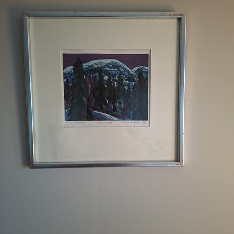 Bilde i spraylakkert, sort ramme. Bildet har tittelen 'snø i Baklia' og er flott vintermotiv i en fin, dempet fargepalett.
