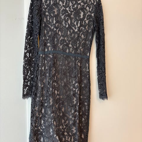 Dette er en lekker blonde kjole i størrelse M. Det er blonder over brystet og rundt halsen samt armene. Kjolen er fôret og går til litt over knærne.