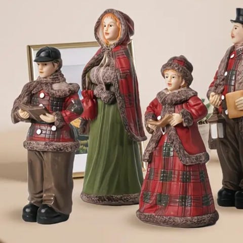 Sett med to juledekorasjonsfigurer, hver med røde klær. Figurene er utformet som barn som synger julesanger, med detaljer som skjerf og noter i hendene. Passer til innendørs juledekorasjon. H=11 cm. Pris per stk. 80,- eller 150,- for begge.