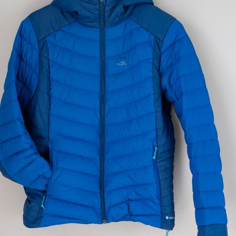 Behagelig og pen Salomon dunjakke i størrelse XS for dame. Jakken egner seg like godt som en lett ytterjakke, som mellomlag under annen ytterjakke eller som en løpejakke på kalde dager. Salomon er en av de mest annerkjente produsentene av løpeklær for terrengløping og friluftsaktivitet.