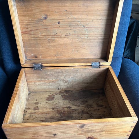 Sjarmerende treveggboks med lokk i lys blå farge. Boksen har slitt maling og patina som viser alder og bruk. Den har et hengslet lokk og hull for oppheng på vegg. Egnet for oppbevaring av små gjenstander. Mål 14 cm bred, 13.5 cm dyp, 26 cm høy.