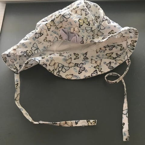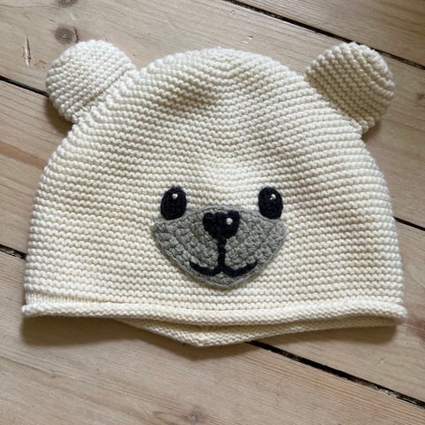Myk lue i pile, foret med bomull og med påsydde ører, et broderi på framsiden og knytebånd. Luen er aldri brukt eller vasket, kun tatt av lappen og blitt oppbevart.