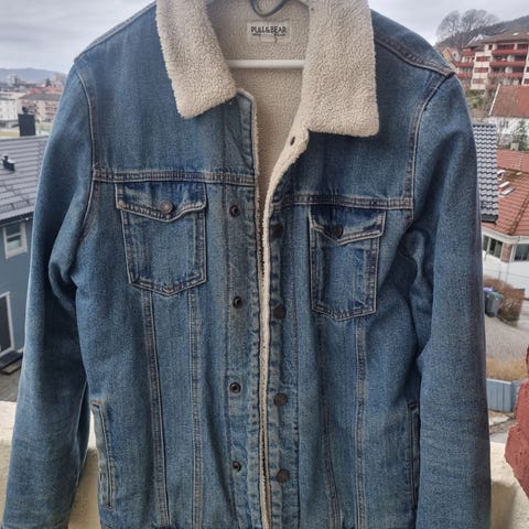 Bershka Denim Jakke i størrelse L for menn. Jakken er blå og laget av denimmateriale. Den har en varm, fleeceforet krage som gir ekstra komfort og isolasjon.