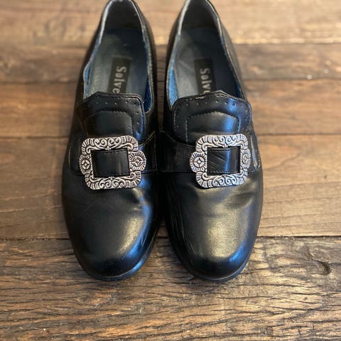 Pene bunadssko i skinn med sølvspenne fra Norsk Festdrakt i strl. 37. Fremstår som brukt, men pent brukt - behov for å pusse tipp.