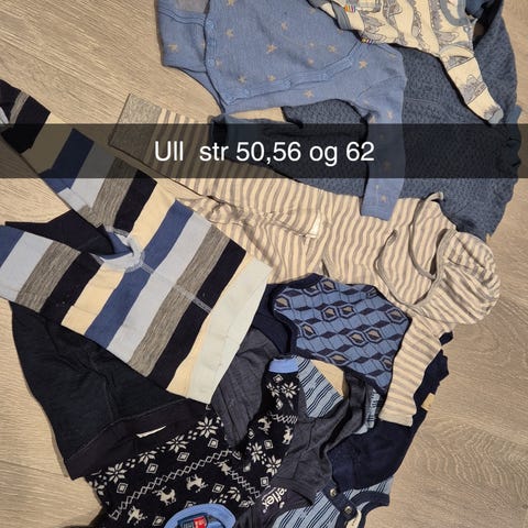 Sett med selvbilde, jakke, lue og 2 par ullsokker. Tilsvarer ca 62/68