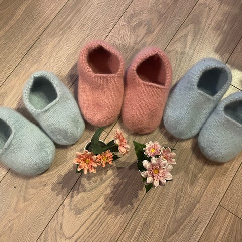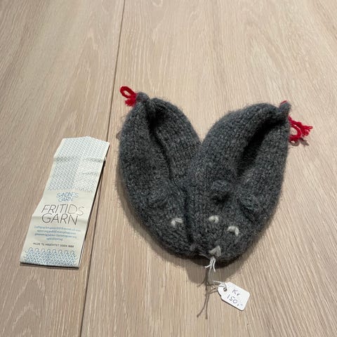 Mangler du en søt liten julegave🎅🏻Hjemmestrikket musetøfler. Strikket med fritidshjem og tovet. Ca 17 cm under fot. Selges 250kr.