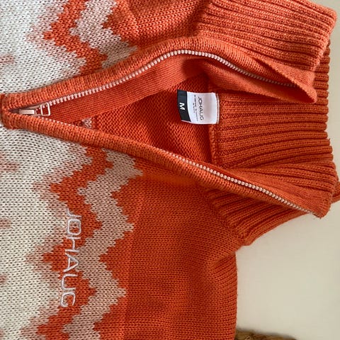 Johaug høyhalset genser i størrelse M for kvinner. Genseren er laget av 50 prosent ull og har en oransje farge med mønsterdetaljer. Passer til bruk i kaldt vær.