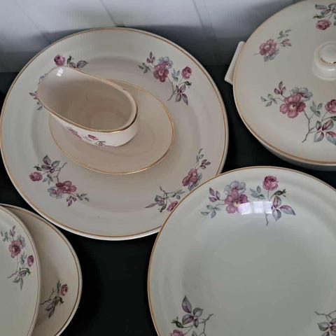 Fem suppetallerkener diameter 22 cm,fem mindre suppetallerkener diameter 19 cm,seks diameter 22,5 cm og suppebolle uten lokk.Fire tallerkener har gule flekker, resten er fine