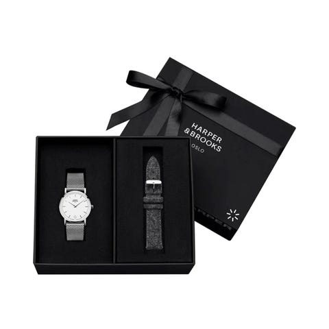 Beskrivelse: SAGA Ull Rose 28MM klokke fra Harper & Brooks. Flotte detaljar, alle med sveitsisk urverk fra Ronda og ripefritt safir-glass. Saga Ull-serien kombinerer den vakre polerte 28mm-rammen. Et elegant og flott dameur. Kommer med både stålreim og ullereim.