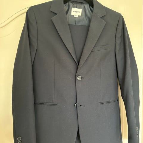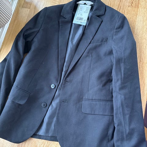 KappAhl barnejakke i mørk blå , laget av bomull. Passer for gutt i størrelse 140. Jakken har en klassisk design med knappelukking og er egnet til formelle anledninger eller som del av en penere barneklærstil.