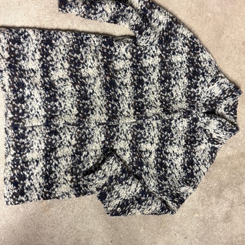 Rodier genser i blå farge, størrelse L for damer. Laget av merinoull materiale, som gir varme og komfort. Genseren har en strukturert strikk som gir et unikt utseende. Litt usikker på om det laget av ull og silke eller merinoull og den kan fint kombineres med ulike antrekk.