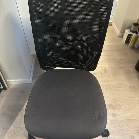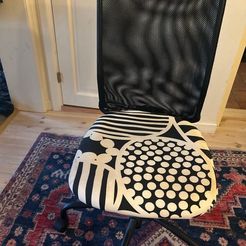 Skrivebordsstolen trenger litt hjelp med hjulene (gummibåndene mangler), men du klarer deg uten. Litt rengjøring av puten, og den har et skikkelig fint design.