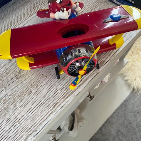 Modell av et M&M’s-fly laget i røde, gule og blå farger. Modellen har to vinger, en propell foran og en karakteristisk M&M’s-figur som pilot. Passer både som leke for alle aldre, som dekorasjon eller som samleobjekt.