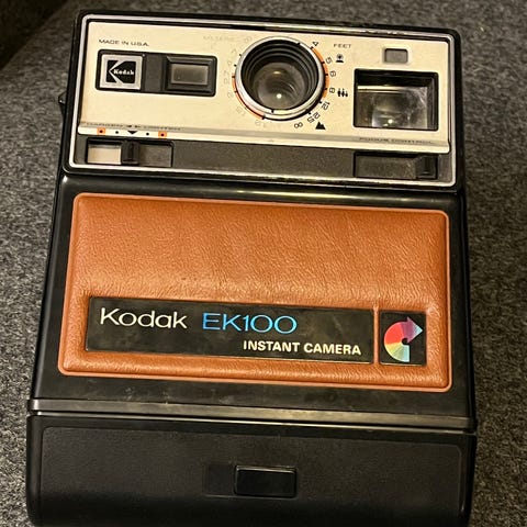 Kodak EK100 Vintage Instant-kamera fra sent 1970 tidlig 1980. Med brun og svart farge, inkludert bæreveske og noen få blitz pærer. Kameraet har umiddelbar bilde fremkalling.