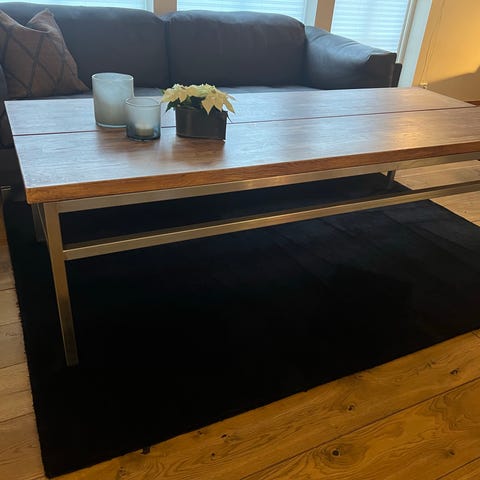 Selvlaget stuebord med eik på topp og siden. Platen under er av ett lettere treverk som bør behandles for å gjøre det litt mer robust. Bordet har fått en liten svai pga dette.