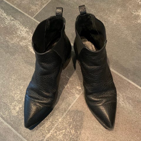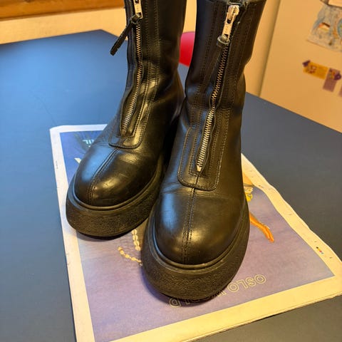 Pavement boots i svart skinn, pent brukt størrelse 40. Støvlene har en tykk såle med godt grep og en enkel, glatt overflate. Egnet for hverdagsbruk og gir god beskyttelse for føttene.