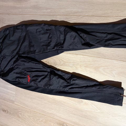 Svart, ski, løpe, track, tykkere treningsbukse med 2 glidelåslommer. Lang glidelås på bena. Lukkes med knapp, hempe, glidelås og knytebånd (båndet ligger i lomma). Strikk i livet. Fleecy innside. 100% Polyester.