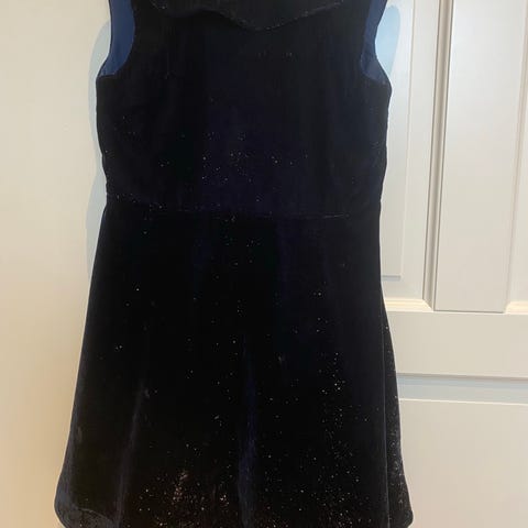 Fin julekjole fra Polarn o. Pyret. Mistet beltet som skal være i livet. Blå bunnfarge med vevd rødt mønster.