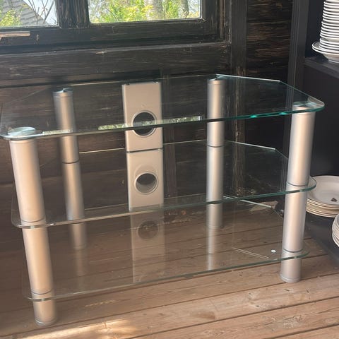 Kraftig hifi-benk på hjul. 3 hyller av herdet glass, som hviler på armer som er boltet fast i den kraftige rammekonstruksjonen. Denne benken tåler mye vekt per hylle. Ble i sin tid kjøpt på Soundgarden. Selges nå pga flytting. Glassplatene kan løftes av, så det skal gå fint å få denne sikkert transportert med vanlig bil.