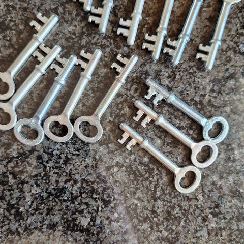 14 stk Hengsler m/ skruer, 8 cm lange og 4 cm bredde. Ikke brukt. 150,- pr. par .
