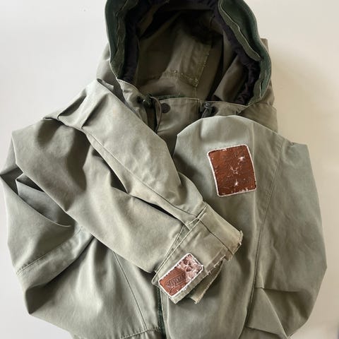Klassisk Norrøna Anojakke som er ferdig falmet og slitt på ermene. Ellers hel og fin. Tåler fortsatt flere 2000-metere.