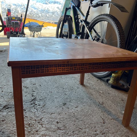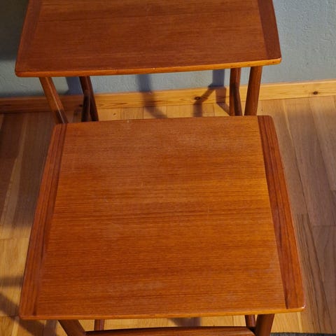 Teak ben. Trukket om med ullstoff hos Tore’s møbelservice i Bodø. Ikke vært i bruk med nye trekk - kun til pynt.