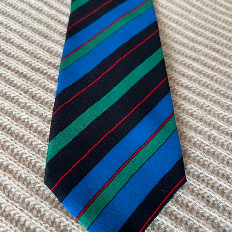 Lekkert alternativ til tørkle i halsen. Ascot med blå bunn og mørkeblå og oransje detaljer. Burgunderrødt fôr. Det ligger stødig i halsen, elegant, samtidig som uformelt. Merket "washable yarn", - mener dette er silke.