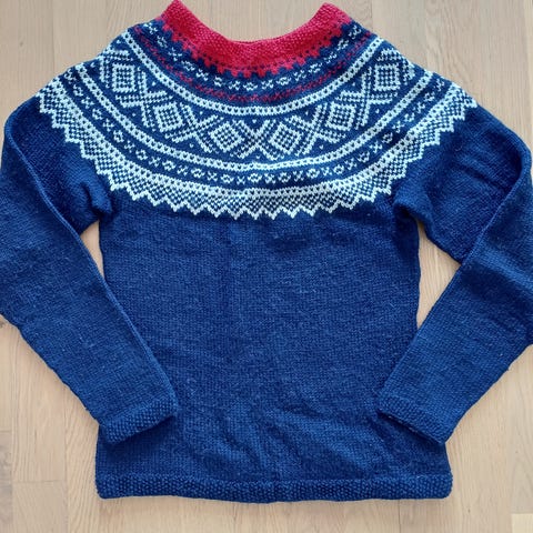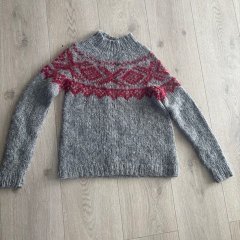 trikket genser i Mariusmønster og rundfelling. Bare brukt et par tre ganger. God og varm selv om den er strikket i tynt garn. Fargen på første bildet er mest riktig. Okergul med lys og mørk grå i mønsteret.