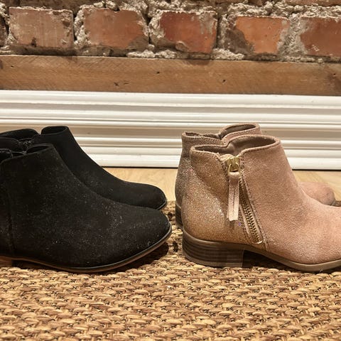 Svarte lave støvletter med sløyfe på siden. Glidelås til å åpne. Glittereffekt