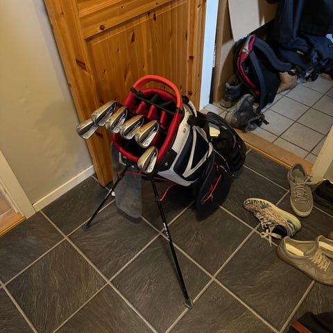 Golfbag med stativ, fargene hvit og svart. Golfbaggen har flere lommer for oppbevaring og et innebygd stativ for enkel plassering på golfbanen.