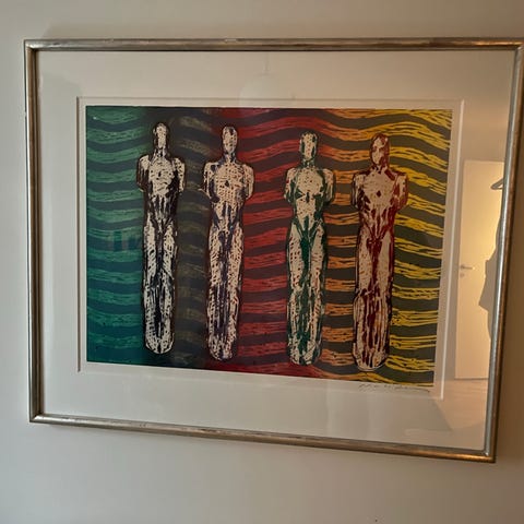 Selger et flott og uttrykksfullt litografi av Nico Widerberg. To Brødre er et av hans karakteristiske figurative motiver, med sterke blå- og okertoner og en detaljert, levende overflate. Verket er signert av kunstneren og nummerert 30/130.