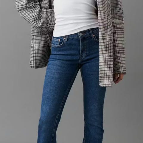 Gina Tricot Perfect Jeans damejeans i blå denim. Størrelse 34 med midjevidde W29. Jeansene har klassisk fem-lommers design og en lett utsvingt benform.